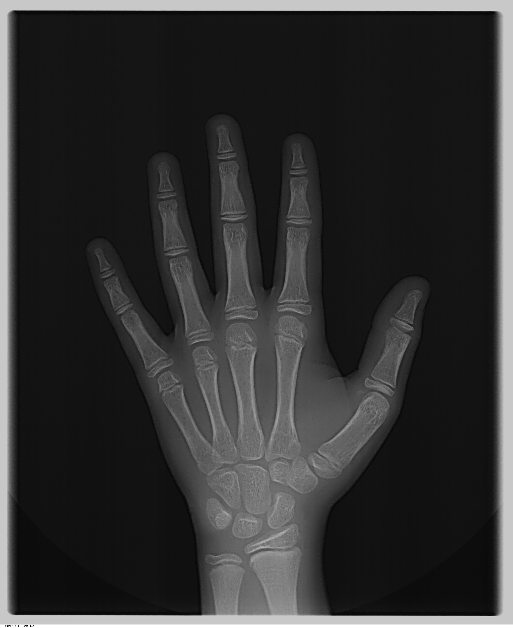 É a radiografia da mão e do punho usada para a avaliação da idade óssea do paciente.